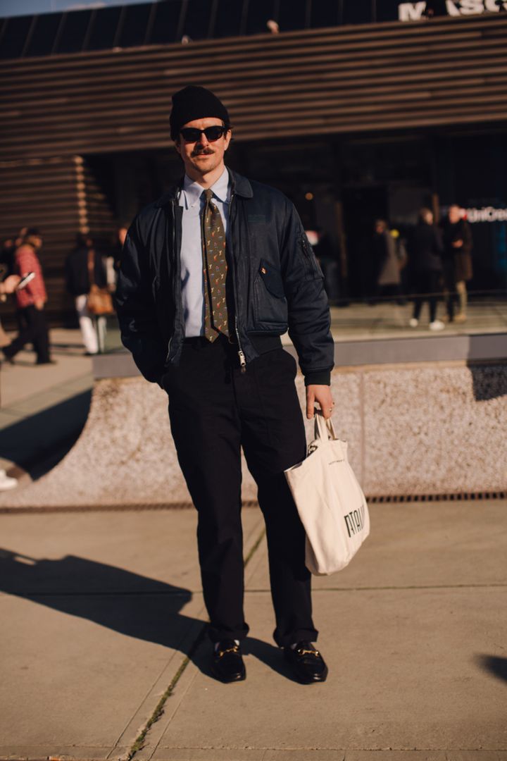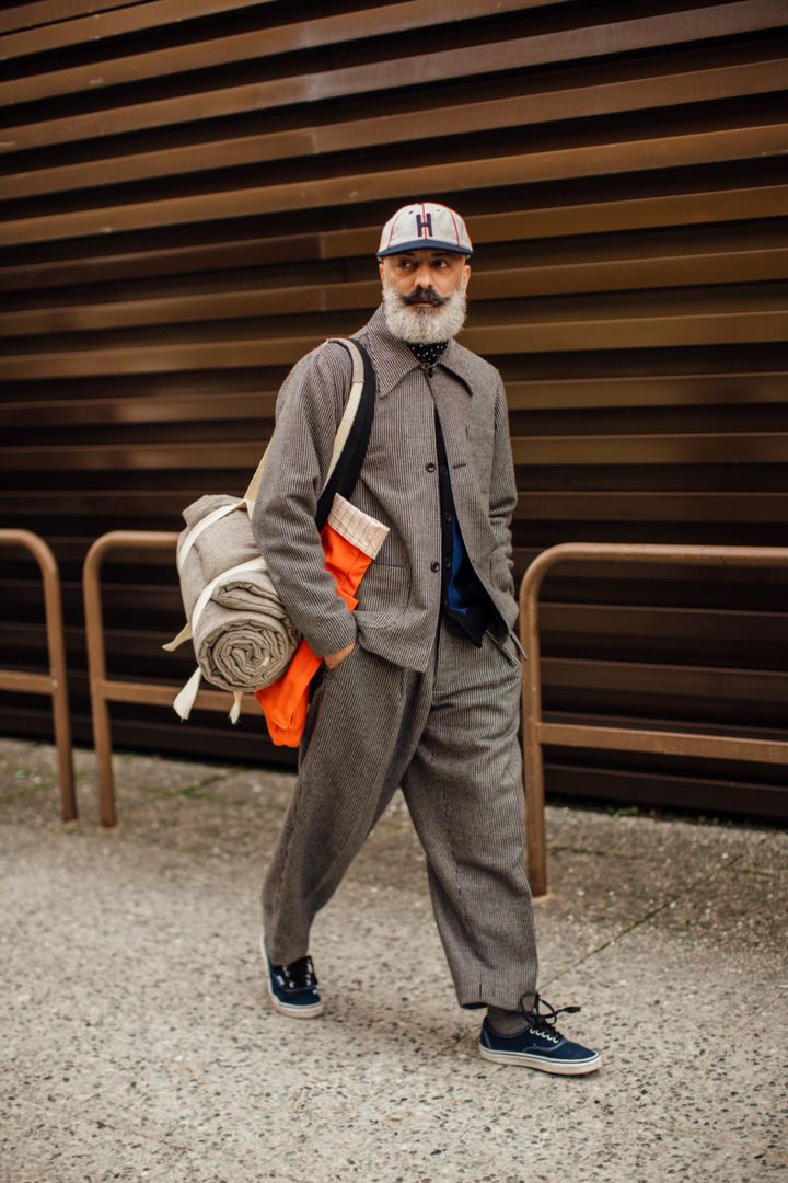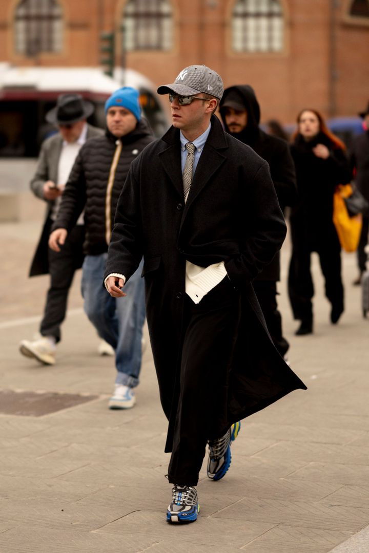 どこかニューヨーカーを彷彿させる、キャップ×タイの組み合わせ。足元は革靴ではなく、日本でも人気のあるサロモンを選んでいるあたりが今季らしい着こなし。