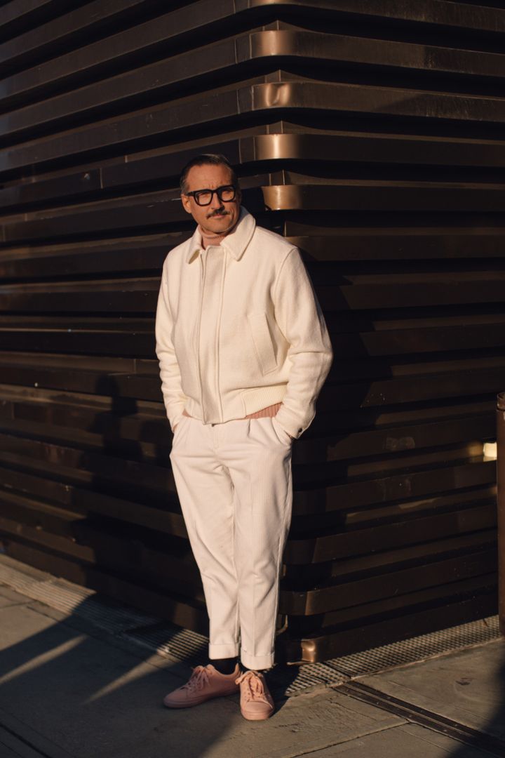 オールホワイトの着こなしに、ピンクのニットとスニーカーがキュート。渋い顔をしながらもスウィートなスタイルに、なんだかギャップを感じます。