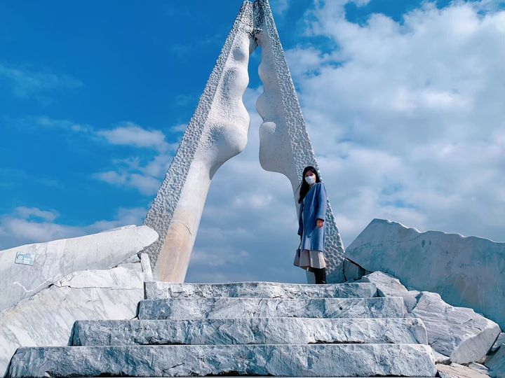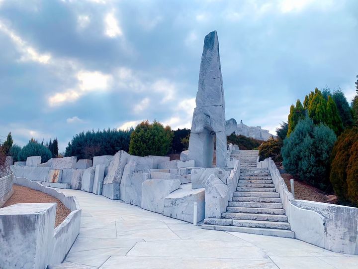 アトリエのあるイタリアで採掘した大理石を様々なモニュメントに加工し、船で運んで設置しているそうです。