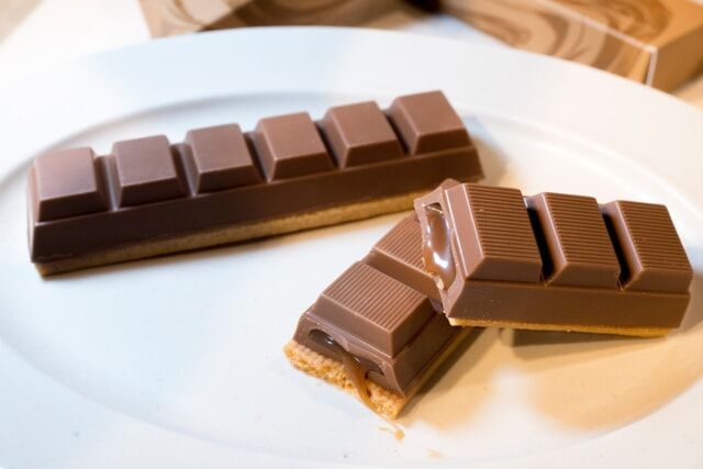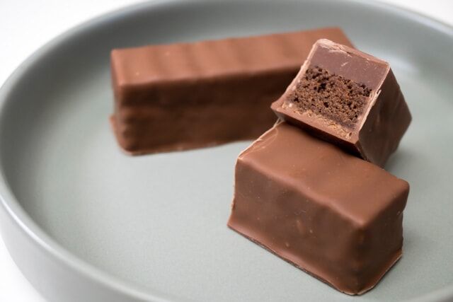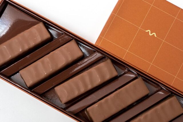 ミルクチョコレートの豊かな味にヘーゼルナッツの香ばしさが加わるチョコラバー「バトン・ドゥ・ミュリル」。トンカ豆の上品な香りやワインの風味がアクセントです。