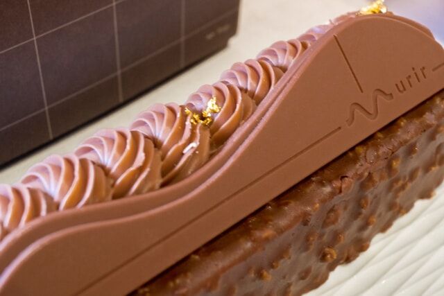 「バトン・ドゥ・ミュリル」の断面は、ヘーゼルナッツのプラリネを敷き、しっとりとしたガトーショコラとコクのあるガナッシュを重ね、オリジナルのミルクチョコレートでコーティング。そこへイタリア・マルサラワインの香りが華やぎます。