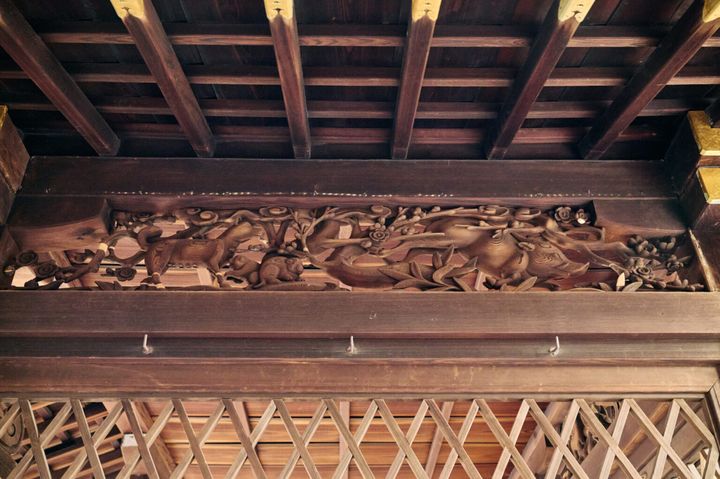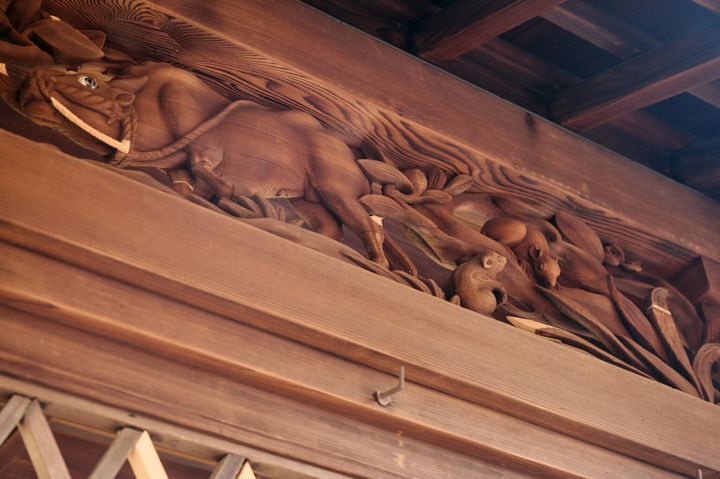 社殿向かって右側から彫刻をぐるりと眺めてみると、なんとすべての干支がずらりと並んでいるではありませんか。そしてどの動物にもガラスの瞳(当時はとても高価)が入っており、財を尽くした造り。木鼻は上半身だけが彫られているのが主流ですが、こちらは足の先まで丁寧に彫られており、そのどれもが可愛らしい親子の姿です。親子が数多く彫られているのは「家が代々続いていく」という御神徳になぞらえたもの。