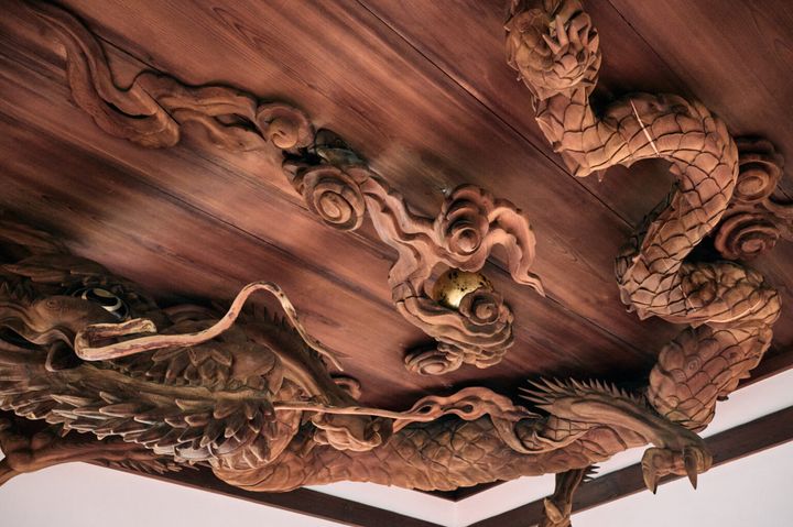 天井中央の雲の奥に輝くのは「宝珠」。よく彫刻や壁画などで、この宝珠を掴んでいる龍を目にしませんか?ですが、この龍はまだ宝珠を手にしていません。これが何を意味するのかというと、“これから”手にする、まだまだ上昇中の龍だということです。
