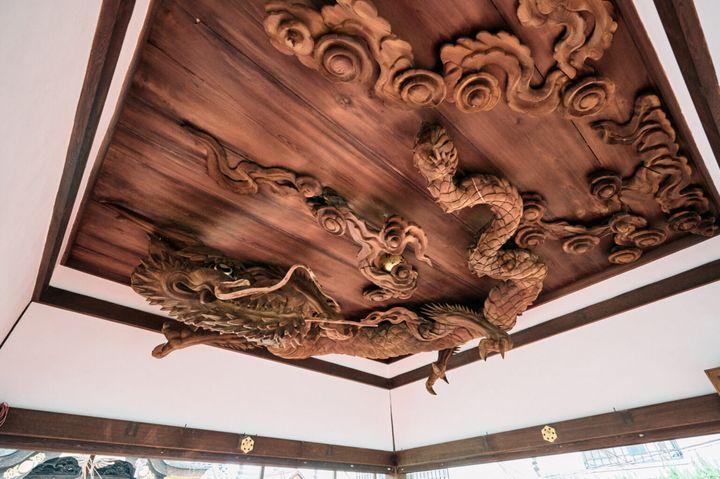 この辺りの住民の間では「夜になると龍が動き出して近くの音無川に水を飲みに行く」という噂が立ち、一時は逃げ出さないようにと金網が張られていたこともあったのだとか。江戸後期の彫刻師・九山新之丞氏8メートルにも及ぶ巨大なを、胴体九山新太郎氏が手がけています。着色がない白木のため木目がしっかり見えるのですが、龍の頬や口に立体感が出るように木目を計算し尽くして彫刻されていることがわかります。彫ってみないとわからない木目を見極める。職人技とはまさにこのこと。