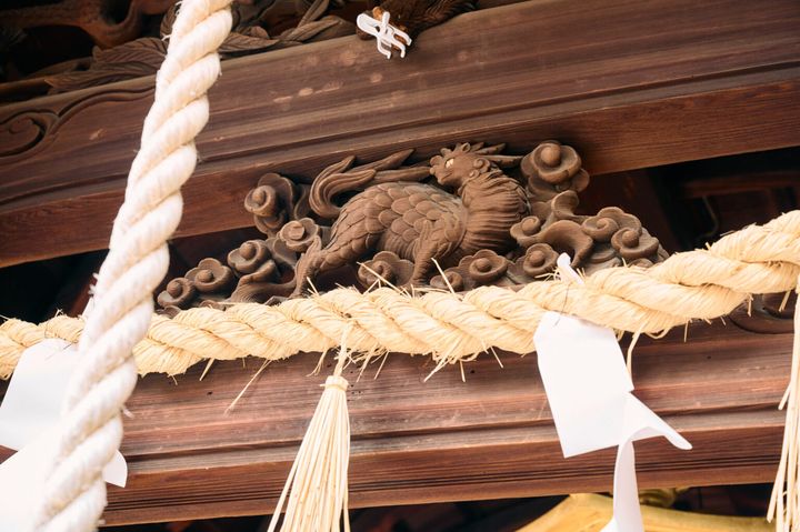 拝所の正面に鎮座するのは『鳥龍(ちょうりゅう)』。四本足で立ち、鱗で覆われた身体、獅子の尻尾を持ち、鳳凰の顔を持つ大変珍しい霊獣です。鳥龍が見られるのはごく僅かなところだけ。その一つに大正天皇即位の礼の際に用いられた「高御座(たかみくら)」に描かれており、その貴重さが伺えると思います。世の中が変わる時に現れる霊獣とされています。