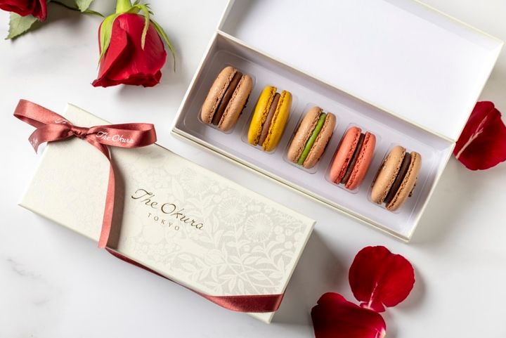 オークラで通年販売の人気商品でもある 「マカロン 五果」も今年初めてバレンタイン限定仕様に。イタリアやフランス産などさまざまなチョコレートと、パッションフルーツや抹茶といったチョコレートに合う王道の素材を組み合わせた信頼の味。