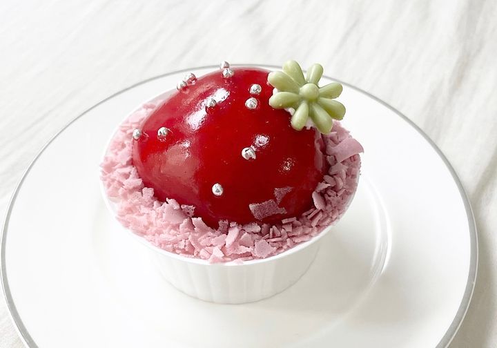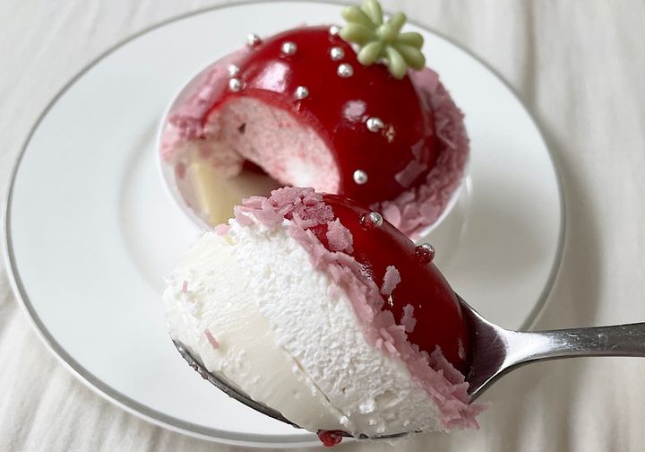 続いて紹介するのは、毎年発売されるたびに大人気の「まんまる苺ケーキ」。いちごムースのなかに、いちごの果肉、マシュマロ、パンナコッタが重なっています。いちごのつぶつぶは、アラザンという、砂糖の粒に薄く銀箔で覆った粒玉を使って再現。ヘタの部分はチョコレートで作られているのだそう。いちごをモチーフにしたまんまるとしたフォルムと、ツヤツヤの見た目がかわいすぎます。