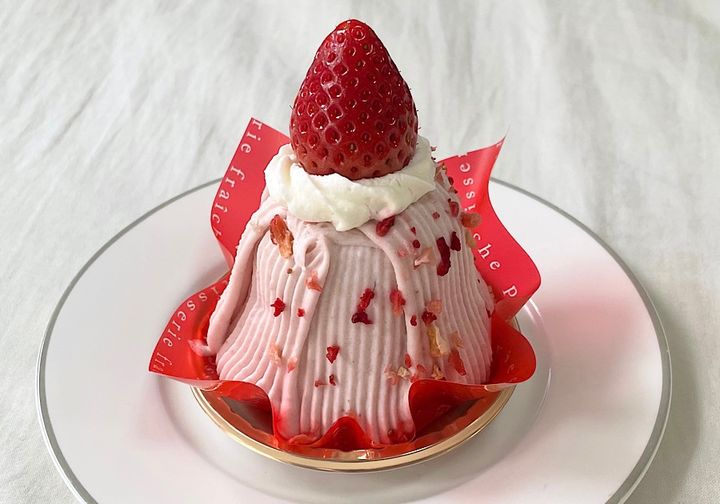 まず紹介するのは「苺と白桃のモンブラン」。いちごがごろっと1つトッピングされていて、ピンクと赤の色合いがかわいらしく存在感抜群。練乳入りホワイトチョコムースといちごのムースに、白桃ジュレを忍ばせ、たっぷりのいちごクリームで包んでいるのだそう。