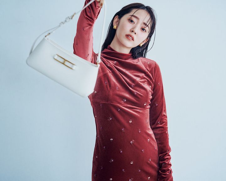 あわせる小物は、女っぽい繊細なムードが出るミニバッグやヒールありの靴がマスト。