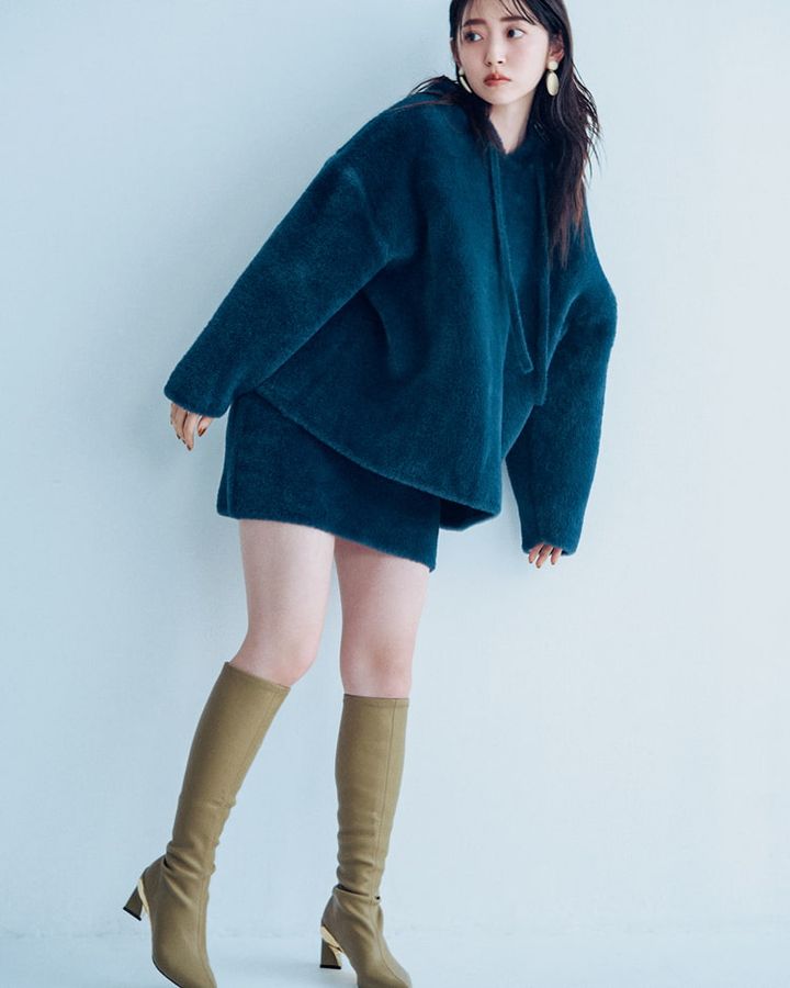 ネイビーフェザーニットパーカとスカートのセット 17,600円/COCO DEAL(ココ ディール) イヤリング 7,560円/アビステ ロングブーツ 16,900円/チャールズ&キース(チャールズ&キース ジャパン)