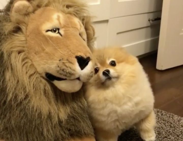 「私たちって少し似てるよね!」ライオンのぬいぐるみに寄り添う犬さん。
