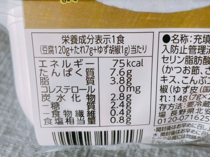1食(豆腐120g+たれ7g+ゆず胡椒1g)当たり 75kcal、脂質3.8g、たんぱく質7.6g、炭水化物2.8g