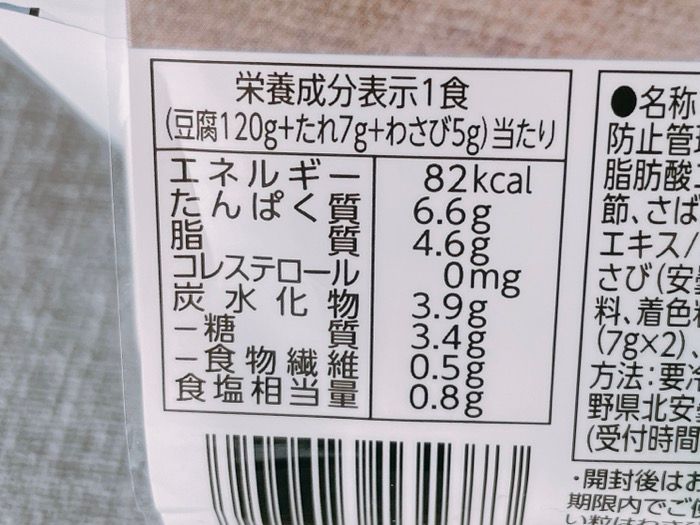 1食(豆腐120g+たれ7g+わさび5g)当たり 82kcal、脂質4.6g、たんぱく質6.6g、炭水化物3.9g