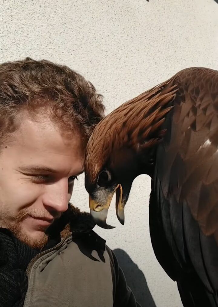飼い主さんにくっつくようにしてくつろいでいるイヌワシ。 このイヌワシが、その大きなクチバシで意外な行動をとり始めました!