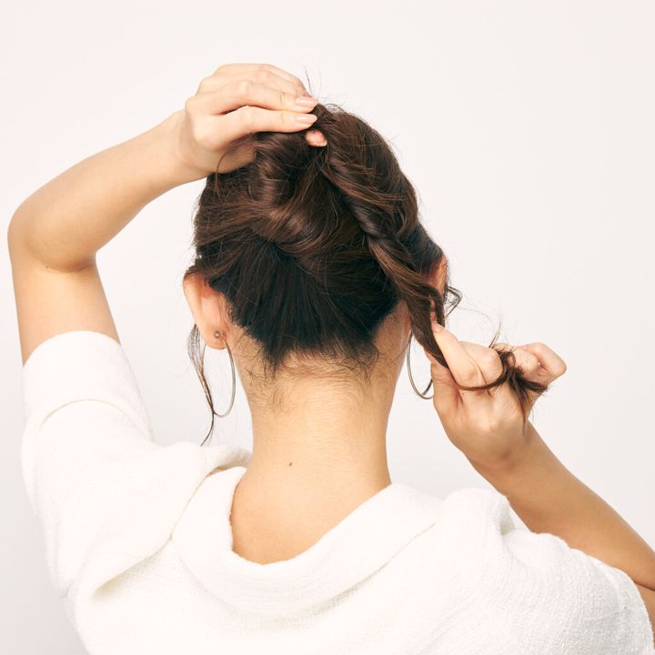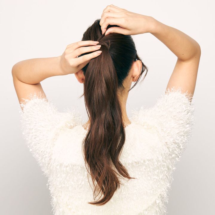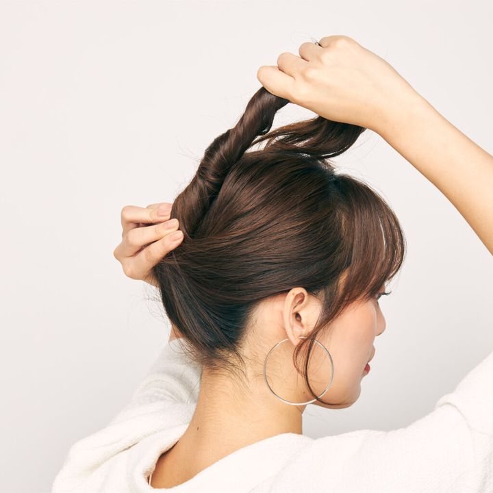 3.ひとつ結びにした位置から5cm上の毛束を折り返し、毛先を下に向けます。