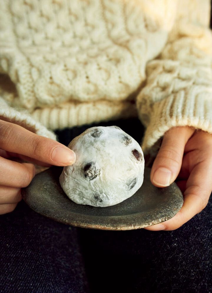 JR山手線大崎駅から徒歩でおよそ5分。高層ビル群と住宅街のちょうど間、百反通り沿いに佇む『髙松屋』。この近所の高輪で生まれ育ち、地元の老舗和菓子店で修業した店主・髙地寿樹さんが営む店だ。そっとつまんでも指が沈むほどやわらかな餅に、控えめな甘さであっさりとしたつぶし餡が詰まった豆大福は、硬めでほんのり塩気のある赤えんどう豆も印象的。一口で様々に感じられる食感と味わいがおいしい。1個¥220(髙松屋 03−4296−6530)ニット¥29,700(ペレグリン/真下商事 03−6412−7081)その他スタイリスト私物