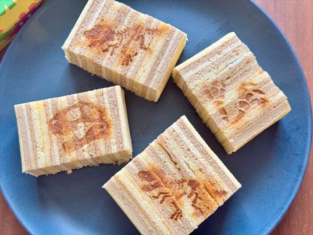 食べやすいように、焼き印に合わせてカットしてみました。こうして見ると、それぞれの焼き印も味があっていい感じ。焼き印があるおかげで、楽しみながらいただくことができます。