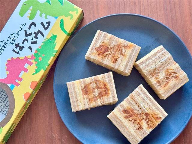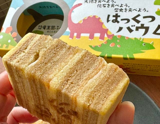 一般的なバウムクーヘンというと、円形のものを想像することが多いですが、はっくつバウムは細長い長方形。重なるバウムクーヘンが地層に見え、まるで恐竜の化石が埋まっているように見えます。