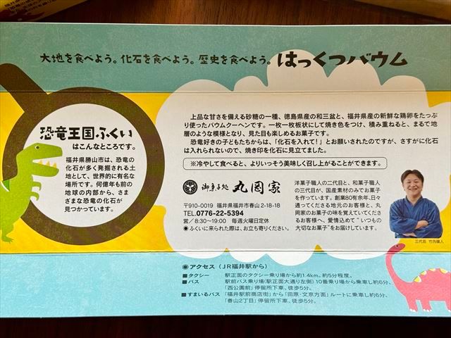 箱を開けると、はっくつバウムの説明のほか、「恐竜王国ふくい」について書かれています。