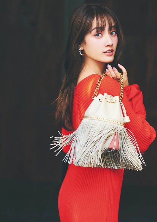 バッグ(W14×H20×D14)¥170,500/J&M デヴィッドソン ニットワンピース¥35,200/styling/(styling/ ルミネ新宿1店) ピアス¥4,950/MEX(ロードス) ネックレス¥46,200〜/マリハ