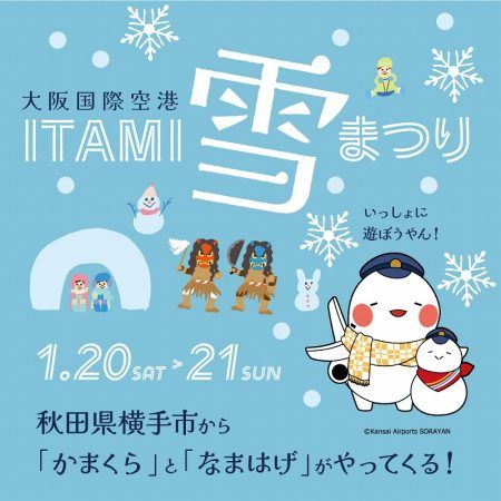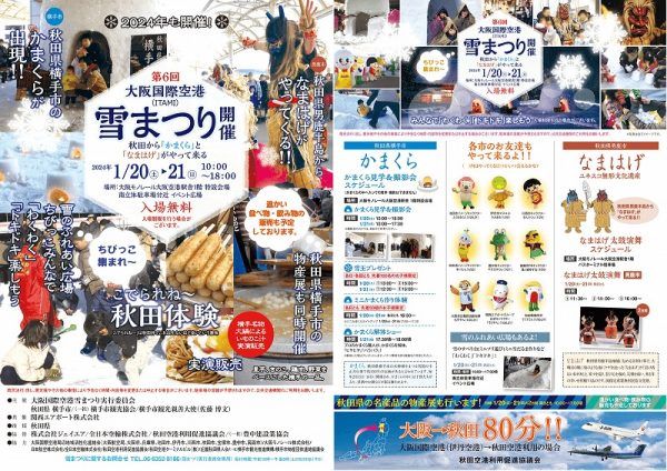 大阪モノレール大阪空港駅舎1階では、秋田県横手市の「かまくら見学」や「かまくら解体ショー」(21日のみ実施)、同県男鹿市の「なまはげ太鼓演舞」や「なまはげと撮影会」のほか、特産品販売、秋田グルメの飲食ブース、抽選会などを実施。