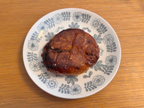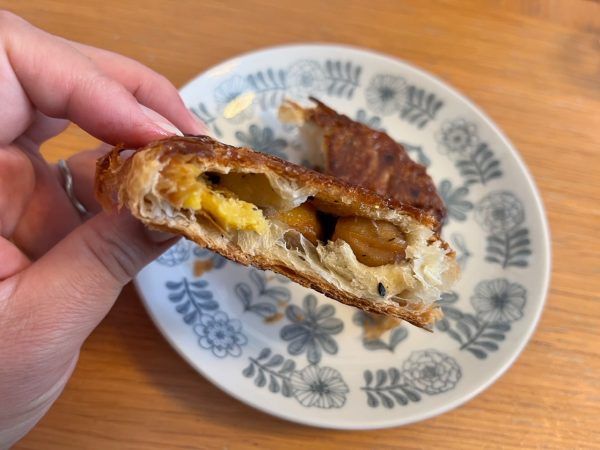 さて、今回購入したセットですが、明太フランスらしきパンと、キャラメル味のパン、白いシンプルなパン、そしてクイニーアマンのように見えるパンの4つという組み合わせでした。私は「クイニーアマンのように見えるパン」にしてみました。