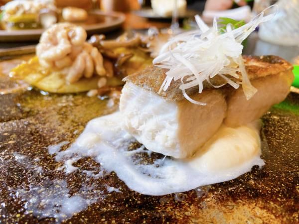 根セロリのソース、山椒の葉、ごま油、白髪ねぎがアクセントになっています。