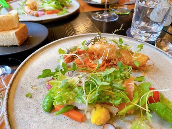 サックサクの衣をまとったエビ、パン粉より油を吸いにくいのか、最初の1品に揚げものながら、あっさり食べられました! サラダの彩りもお洒落~!