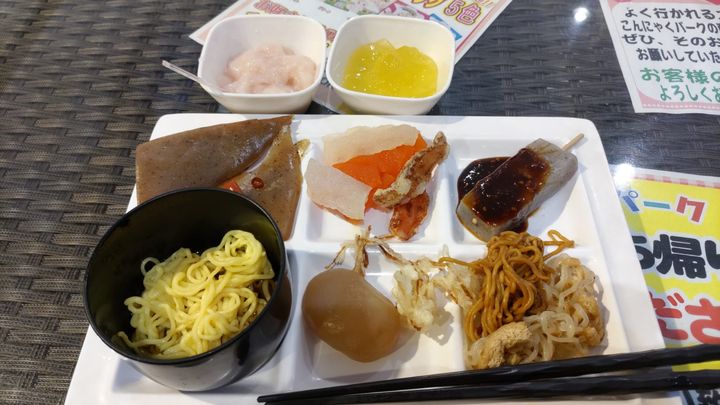 は有料で楽しめます。こんにゃくバイキングはおいしくて、残さずいただきました。子どもたちには焼きそばや唐揚げの評判が良かったです。