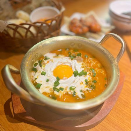 おうちでもマネしたくなった「韓ロゼラーメン」(968円)。韓国のインスタントラーメンを「安楽亭」特製スープで仕上げ、上に生クリームをのせたら完成です。