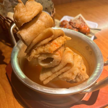 寒い冬に食べたいアツアツの「明洞屋台おでん」は、韓国の練り物「オムク」が大きい!大根と卵も入って、ボリュームたっぷりです。(638円)