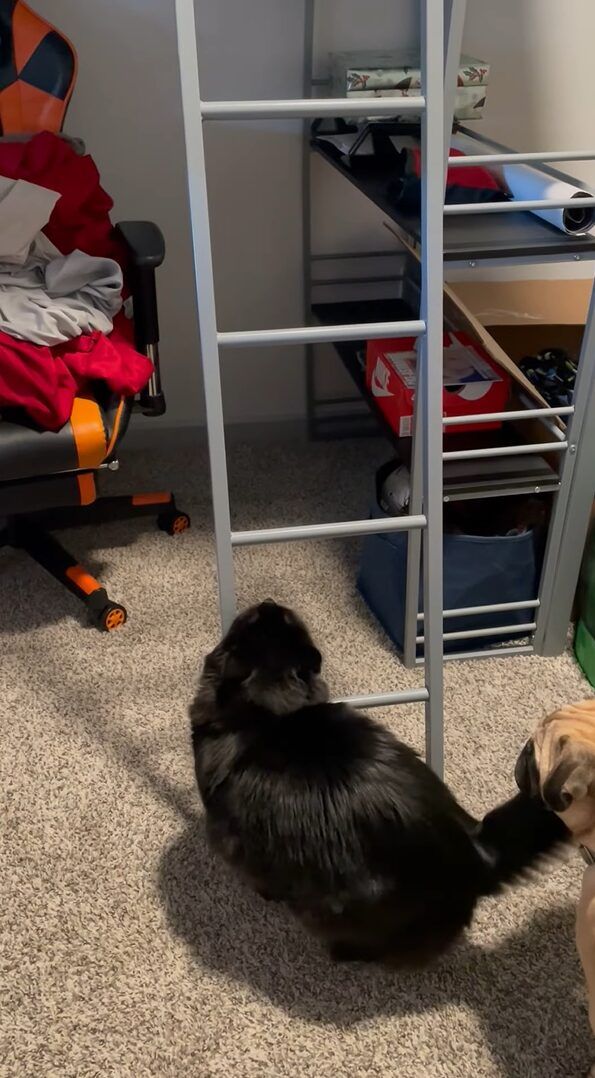 そのままヒョイッとはしごを登りはじめました! 同居犬のパグ『フィグ』が見守る中、どんどん登っていきます。