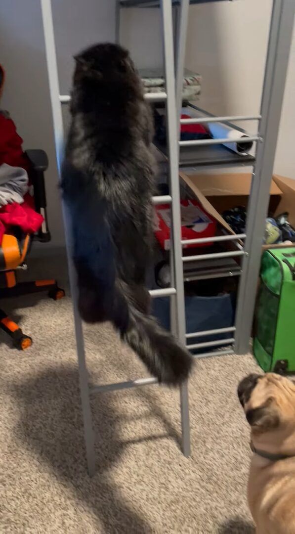 ベッドでのんびりくつろぎたい?黒猫がはしごをゆっくり進んでいく【アメリカ・動画】