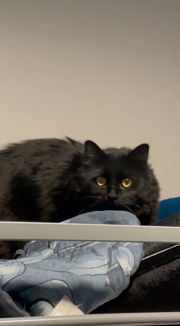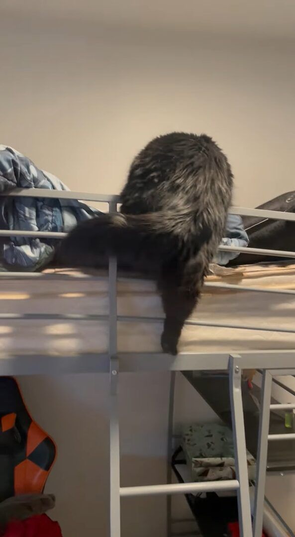 ベッドのはしごをゆっくりと進む黒猫。 その様子は、こちらの動画からご覧いただけます!