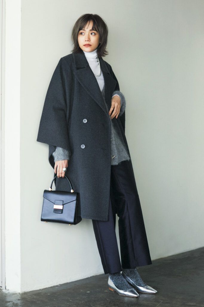 トレンドのラメアイテムも、ソックスなら取り入れやすい。シルバーのパンプスとも相性抜群です。ラメソックス¥880(靴下屋/タビオ)パンプス¥68,200(ペリーコ/アマン)コート¥48,400(メゾンスペシャル/メゾンスペシャル 青山店)ニットカーディガン¥19,800(CELFORD/CELFORD ルミネ新宿1店)タートルニット¥13,200(ハウス オブ ロータス/ハウス オブ ロータス 二子玉川店)パンツ¥48,400(ルーム エイト ブラック/オットデザイン)バッグ¥198,000(セルジオ ロッシ/セルジオ ロッシ カスタマーサービス)ネックレス¥58,080〈ペヨテ・バード・デザイン〉リング¥44,000〈バルブス〉(ともにZUTTOHOLIC)