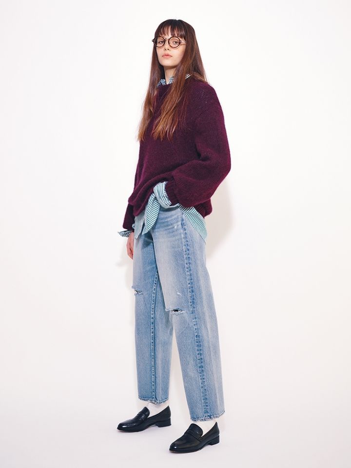 ダメージの効いたデニムを格上げするのは、重厚なパープルカラーのニット。明度は控えめなので、明るめなブルーデニムと合わせて、今ちょうどいいカラーリングに。間にグリーンのストライプシャツをさして、上下の2色を中和する役割も。