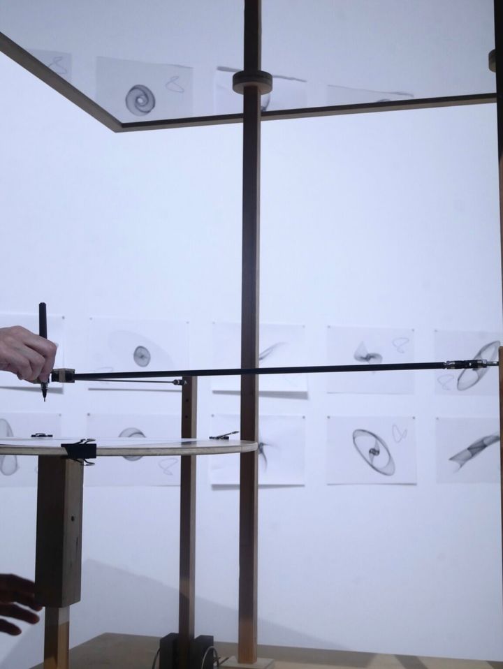 部屋の一角に、アンバランスな木製機械が設置されていた。中央にはペンを固定できる装置。下部分には3本の細い棒に錘がいくつか付いており、その絶妙なバランスに思わず立ち止まる。振り子を用いて幾何学像ができあがる機械は“ハーモノグラフ”というそうだ。子どもの頃の、おもちゃで遊ぶようなワクワクした気持ちを想起させる。