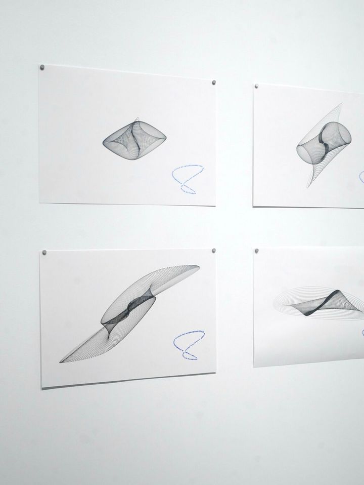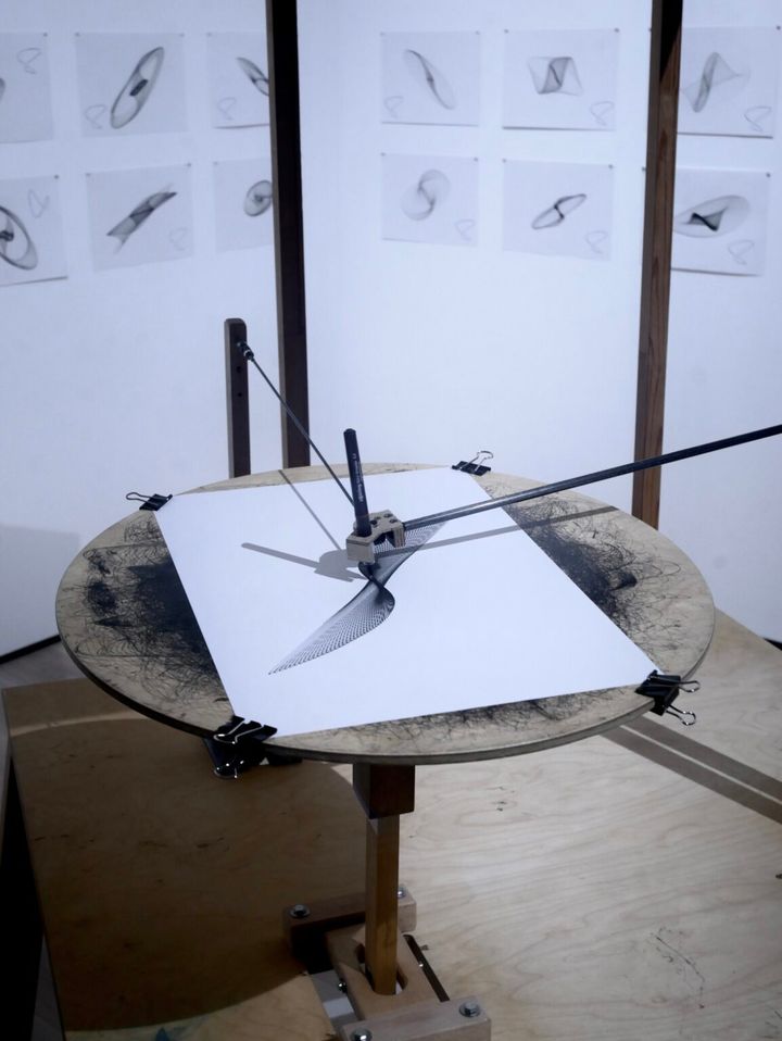 会場では、美術館スタッフが中央の天板に紙とペンをセットし、天板が回り出したら、そのあと好きな力の加減でペンを引っ張る。ペンを離すとそれぞれが歯車のように組み合わさり、勢いよく動きだす。この様をみて個人的に工場見学をしている気分にもなった。仕組みとして働くことで、生成物が生まれ続ける。
