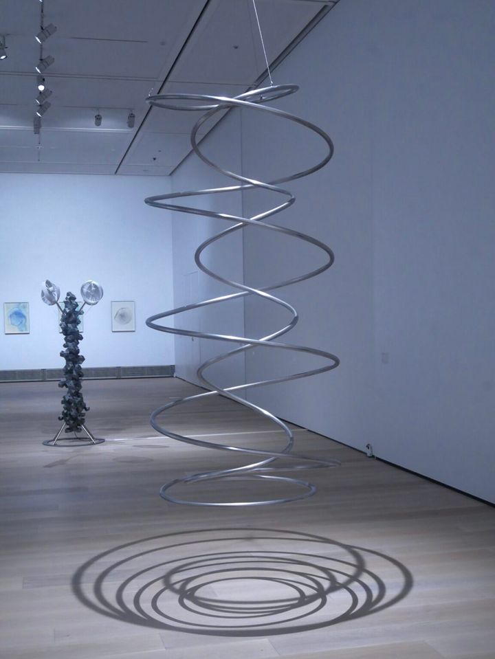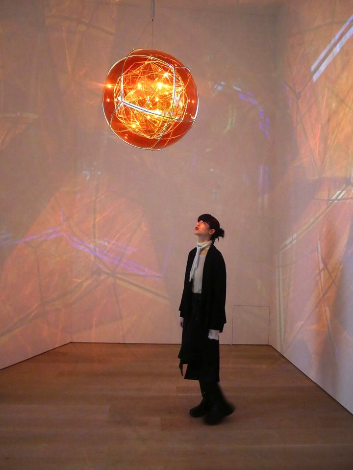 入り口に登場した新作『蛍の生物圏(マグマの流星)』は、天井に吊るされたオブジェがくるくると回り、白い壁に反射や光を通して思わず長い間眺めてしまうような展示であった。