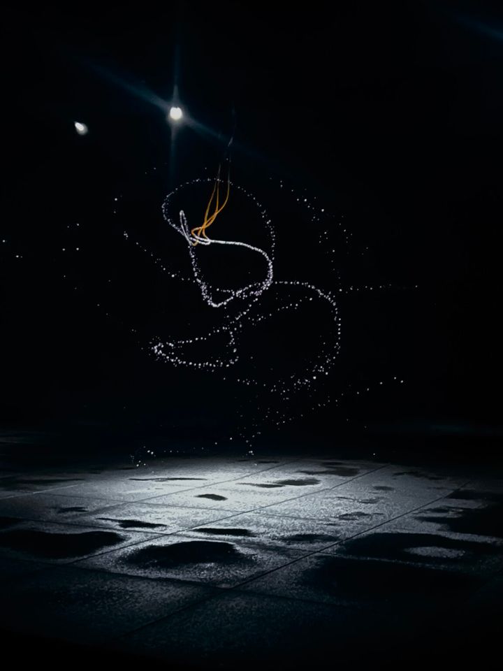 ラストは本展のメインとも言える水を使った大型インスタレーション作品『瞬間の家』のブースに移動する。真っ暗な空間では自分の五感や六感により意識を向けることとなる。ここでは椅子に座って鑑賞する。光や水がすごい速さで交互に連鎖し、水の粒と照らされる光は空中に浮かび上がる彫刻作品となる。これらは写真や文章ではうまく伝わらないため、是非体感してほしい。