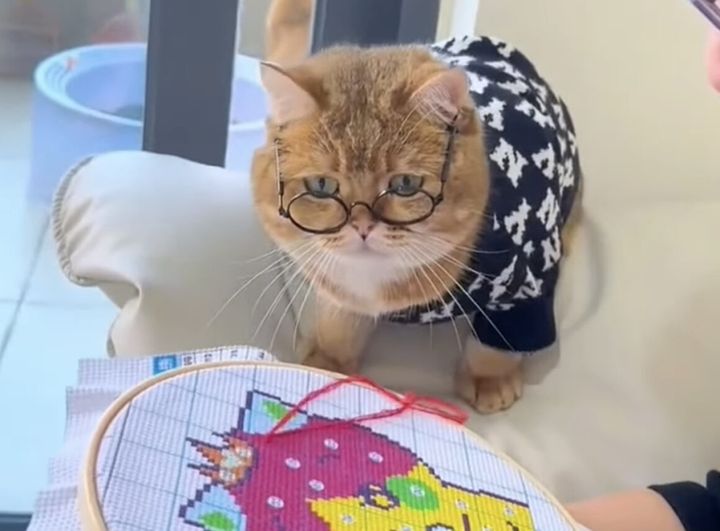 3. 刺繍が気になる猫ちゃん、そんなに見られるとやりづらいよ!