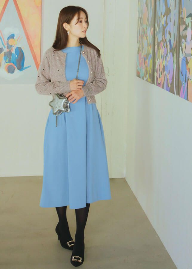 カーディガン¥15,400/ジャスグリッティー ワンピース¥19,800/CELFORD イヤリング¥14,300/masae(ロードス) バッグ¥42,900/ケイト・スペード ニューヨーク(ケイト・スペード カスタマーサービス) タイツ¥1,650/17°C(17°C by Blondoll 横浜ジョイナス店) 靴¥24,200/銀座かねまつ(銀座かねまつ6丁目本店)