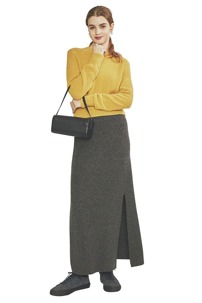 ニットスカートとの合わせもラフすぎず品よくまとまる