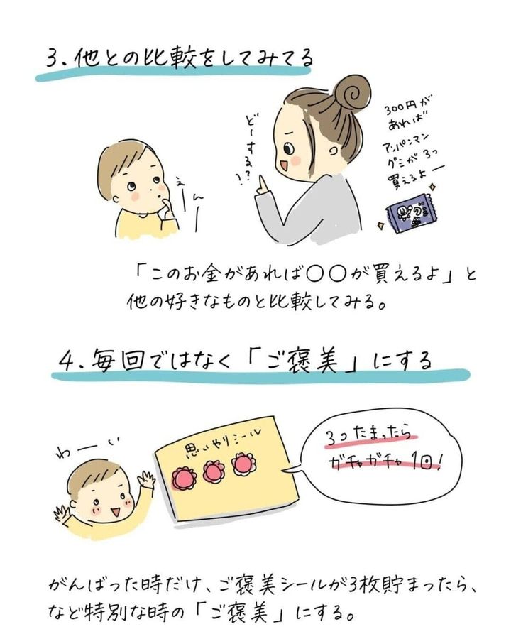 ガチャガチャに使う300円があれば、自分の好きなお菓子が三つ買えるなど、身近なもので比較することで子どもにも分かりやすく、子ども自身でも物の価値を考えるきっかけになりますよね。