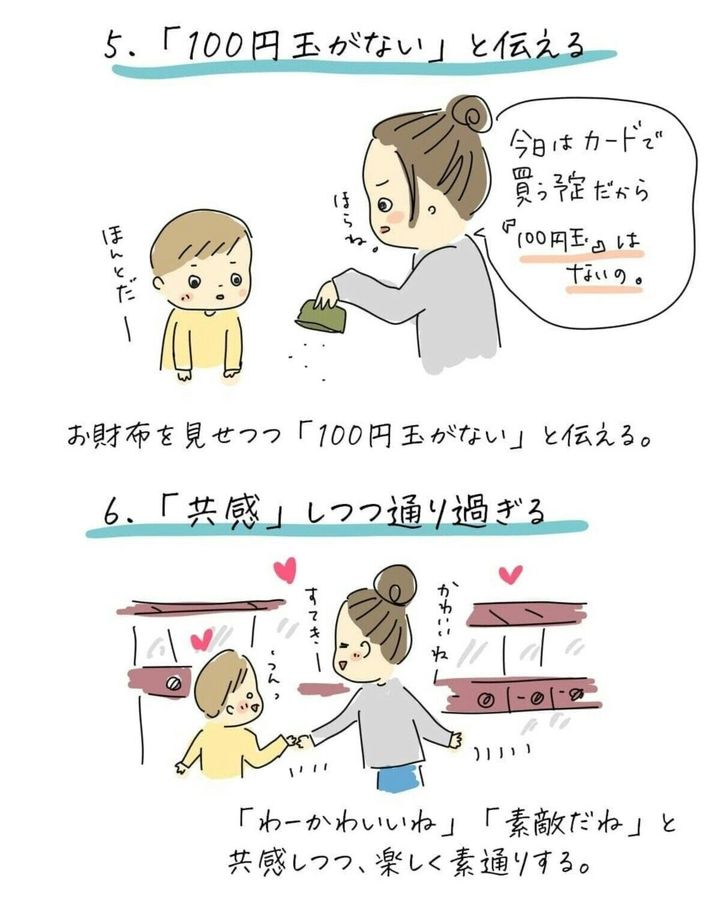 財布を見せて「100円玉が無いからできない」とはっきりとした理由を伝えることで、子どもも納得せざるを得ず、理解できるかもしれません。ごまかさないことも大事ですよね。