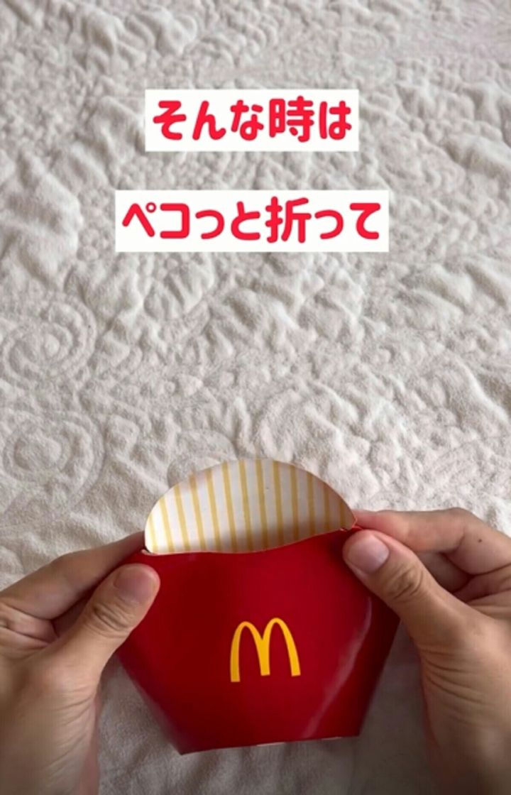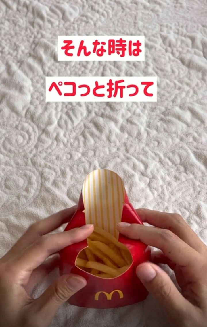 子どもたちが大好きなマクドナルドのフライドポテト。買ったはいいものの、最後まで食べずに少し残すときがありますよね。さらに、親が食べようとすると「後で食べる!」というときも。箱のままでは持ち帰りにくいですよね。そんなときは、SNSでさまざまな子育てハックを発信している、みかん【シェアハピ育児ハッカー】(@mikan_momhack)さんの裏技を使えば解決しますよ!ぜひごらんください。