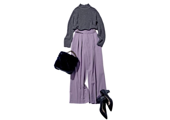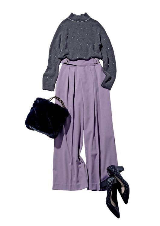 パール付きニット¥6,590/ZARA(ザラ)、カラーワイドパンツ¥10,900/イェッカ ヴェッカ 吉祥寺、エコファーバッグ¥13,750、キルティングパンプス¥18,700/ともにダイアナ(ダイアナ 銀座本店)