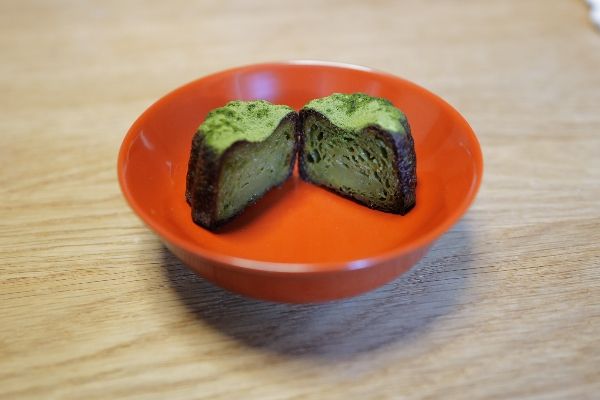 購入した翌日、抹茶のカヌレをパンフレットのとおりに焼いてみました。「2分程焼いて、冷めるまで待つ」と書いてありましたが我が家にはオーブントースターがないので、半分に切ってからコンロでホイルをかぶせて焼きました。アールグレイと同様、切ったときに抹茶の香りがふわっと漂います。ああ、もう食べてしまいたい。