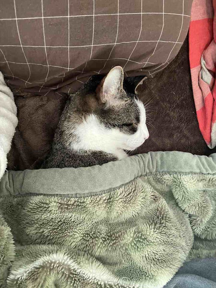 飼い主さんのベッドで先に寝ている猫。 毛布をかけているその姿、いい夢を見ていそうです。