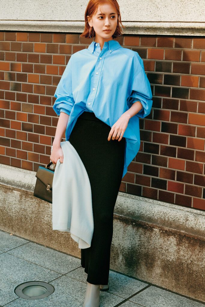シャツのフロント部分だけを山なりにIN。ゆるっと余裕を持たせたシャツ×タイトスカートがこなれたバランスを作ります。シャツ¥19,580(ザ シンゾーン/シンゾーン 表参道本店)スカート¥29,700(カオス/カオス丸の内)バッグ¥385,000(ロウナーロンドン/エイチ アイ ティー)ストール¥67,200(アソース メレ/アイネックス)ブーツ¥33,000(銀座かねまつ/銀座かねまつ6丁目本店)ピアス¥31,900(マリハ)ネックレス¥9,350(イン ムード/フィーティーン ショールーム)